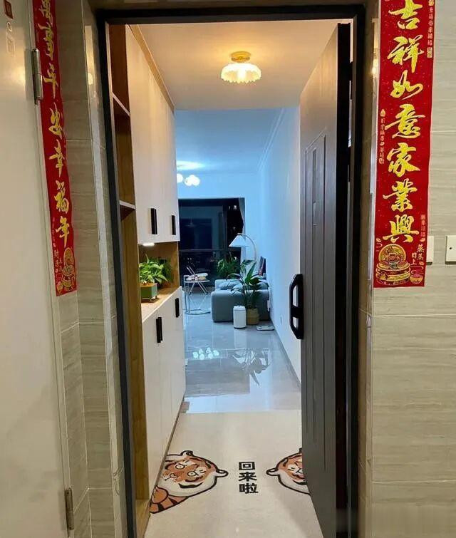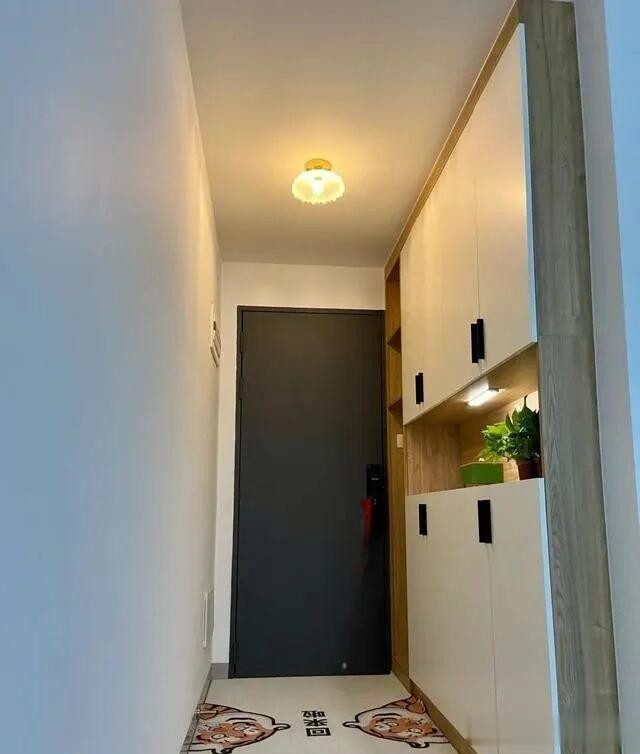 玄关也不复杂,灰色黑板漆门,还能我方涂鸦,带点庆典感。