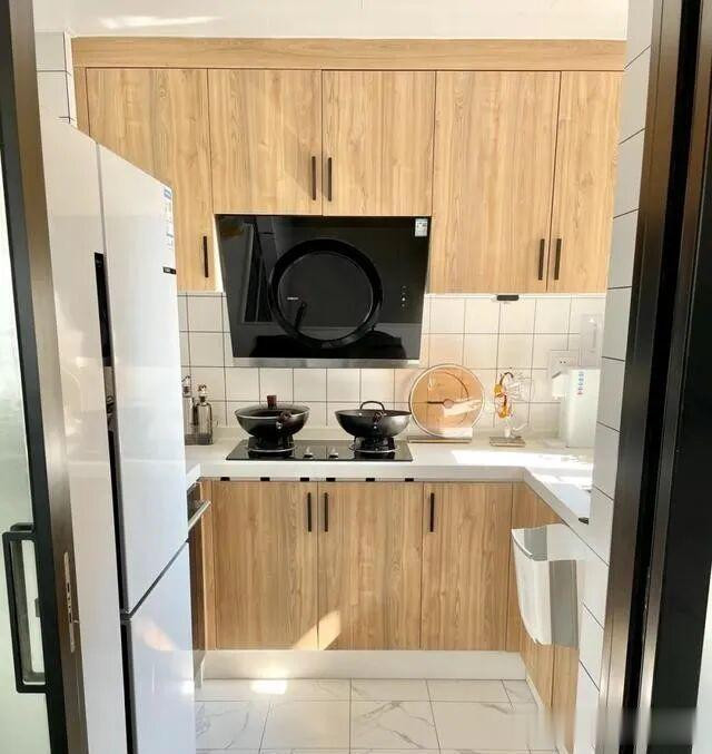 厨房呢,U型原木柜搭配白色台面——簇新温存。
