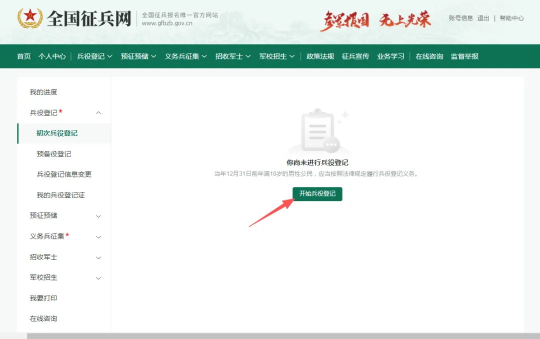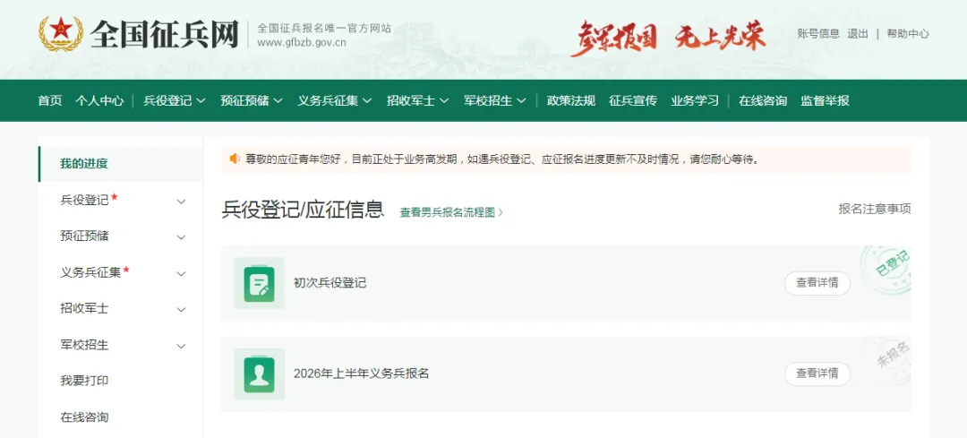 5、在“我的进度-兵役登记/应征信息-初次兵役登记”中显示“已登记”即可。