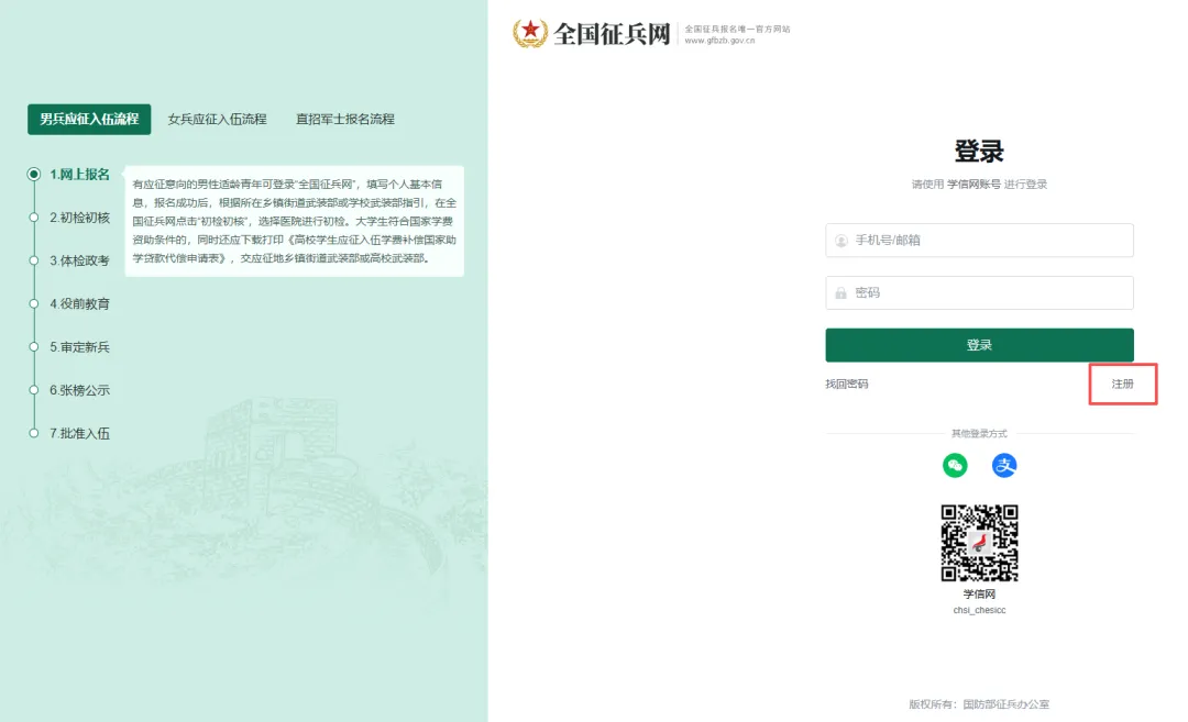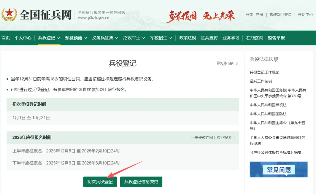 1、进入全国征兵网首页,尚未进行兵役登记的适龄男青年,点击“兵役登记”进入页面进行登记。