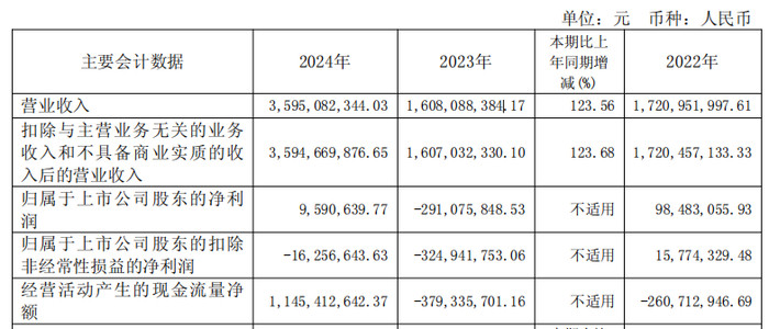 2024年,亚信安全实现营业收入35.95亿元,同比增长123.56%;归属于上市公司股东的净利润959.06万元,上年同期为-2.91亿元;归属于上市公司股东的扣除非经常性损益的净利润-1625.66万元,上年同期为-3.25亿元;经营活动产生的现金流量净额为11.45亿元。