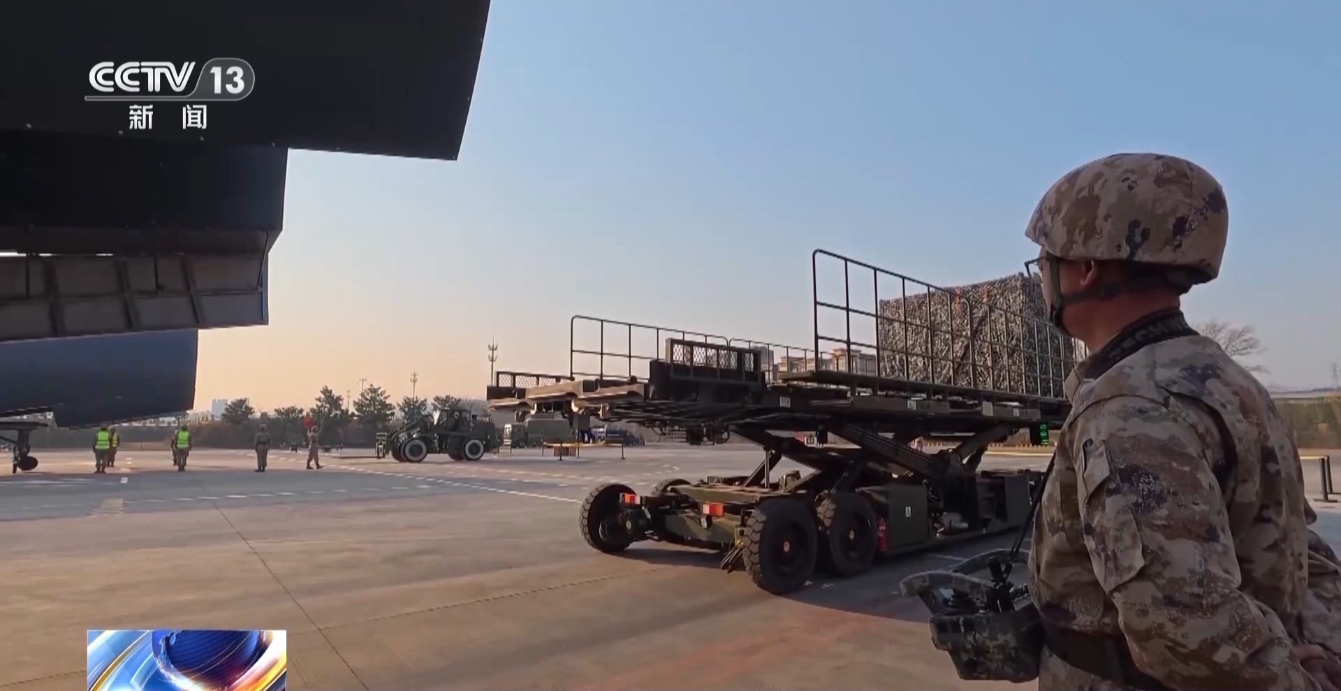 与此同时,物资投送分队在接到紧急运补任务后,依托智能装卸平台将前方急需物资快速装运至运输机机舱。