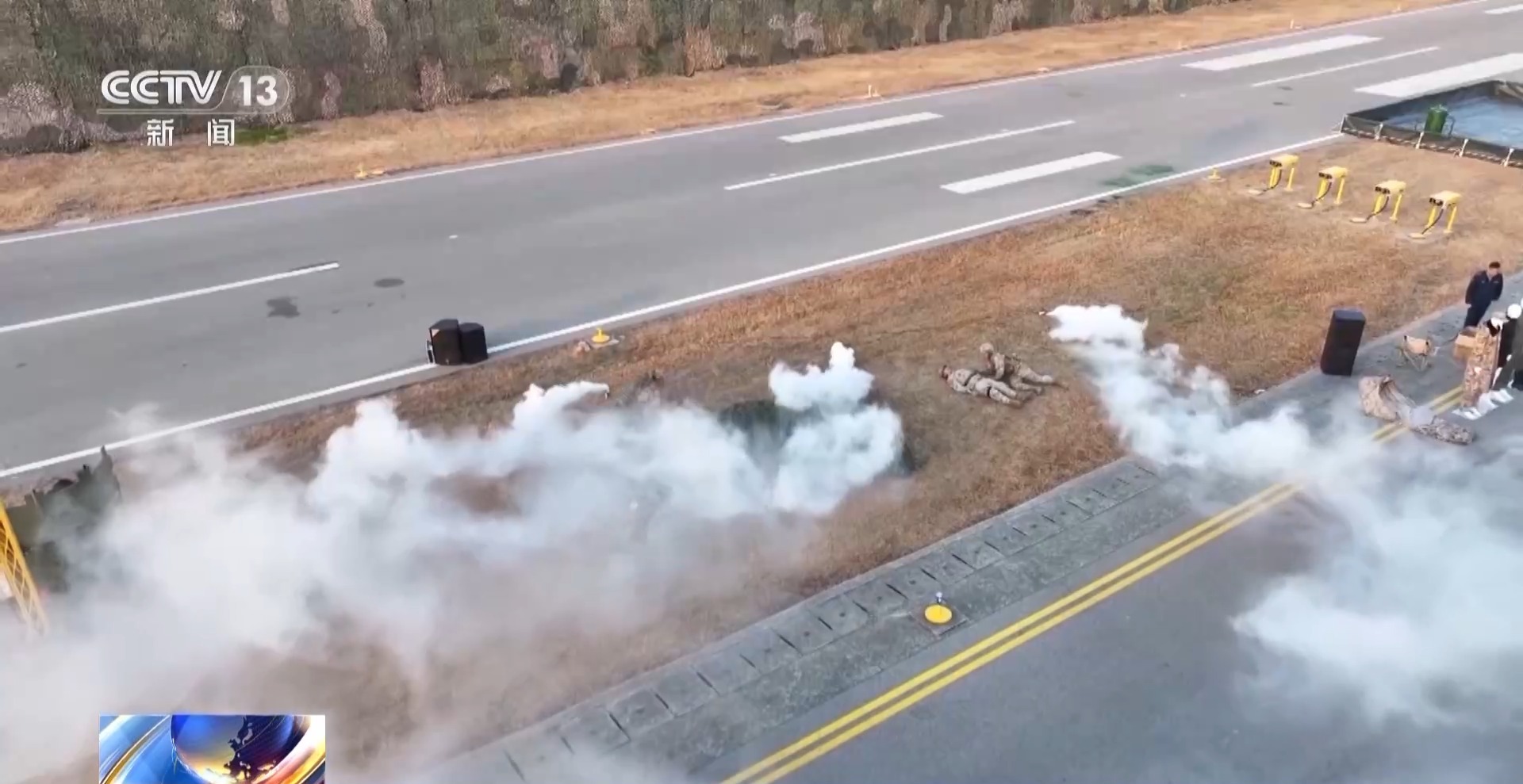 演练模拟某场站遭“敌”袭击,造成人员伤亡和设施毁伤。官兵迅速展开毁伤勘察作业,根据无人机回传画面实时评估机场毁伤态势。随后,无人推扫车、无人机等新型设备快速出动,对地面及地下存留的未爆弹进行排除。
