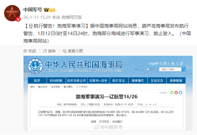 【航行警告!渤海军事演习】据中国海事局网站消息,葫芦岛海事局发布航行警告,1月12日0时至14日24时,渤海部分海域进行军事演习,禁止驶入。(中国海事局网站)
