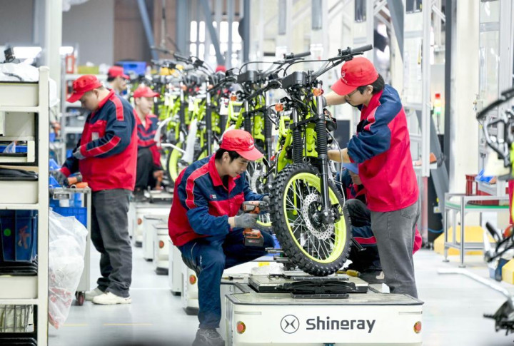 重庆两江新区“张雪机车”坐褥车间整车总装活水线。